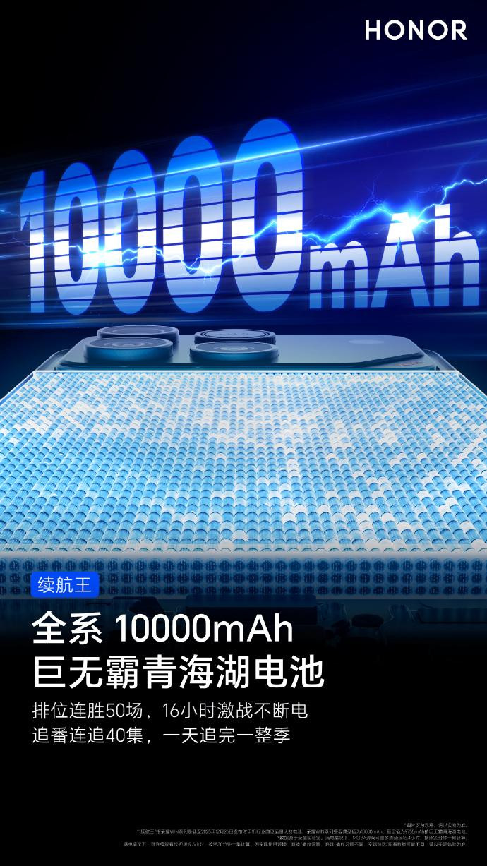 官方预热显示,荣耀 WIN 将搭载第五代骁龙 8 至尊版旗舰芯片、LPDDR5X 至尊版内存与 UFS 4.1 闪存,并配备 10000mAh 巨无霸青海湖电池和自研幻影引擎 3.0。